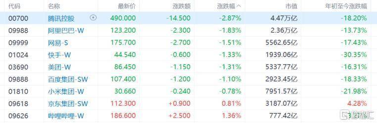 大型科技股多数下跌,腾讯跌超2%,阿里、网易、快手、美团、百度等收跌超1%;哔哩哔哩涨超1%,京东飘红。