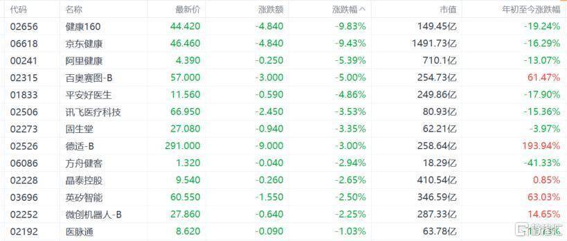 互联网医疗、AI医疗概念股跌幅居前,健康160、京东健康跌超9%,阿里健康跌超5%,平安好医生跌超4%。
