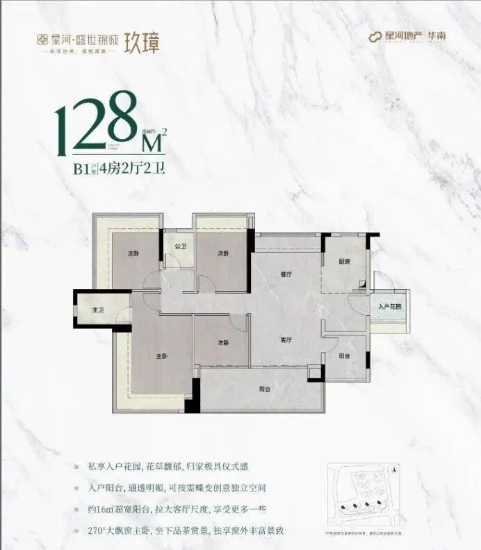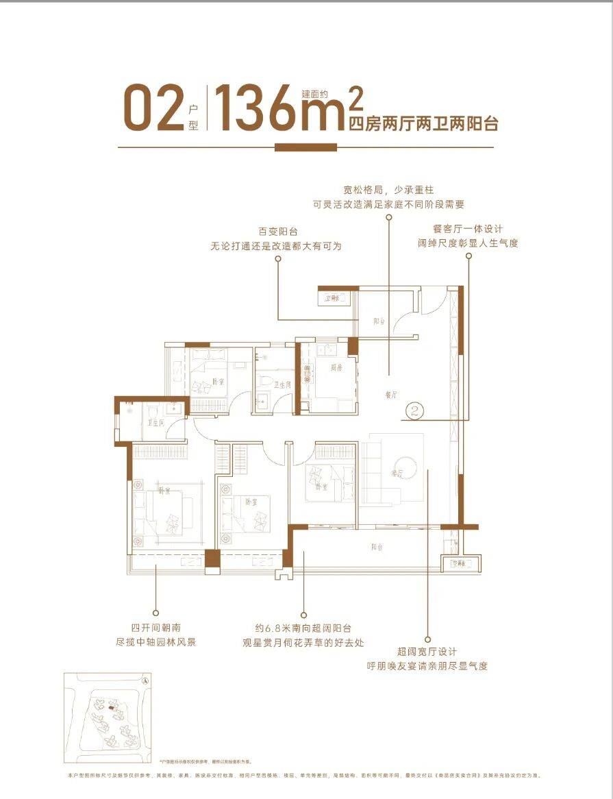 有三个面积段,98-110-128㎡三至四+1房,共有5个户型,都是新规设计,实用率达100%以上。