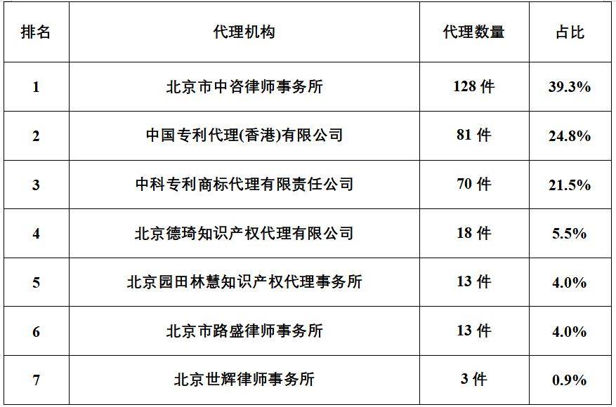 再看一个细节——爱立信选择的专利代理机构。根据数据,爱立信在中国的专利代理高度集中: