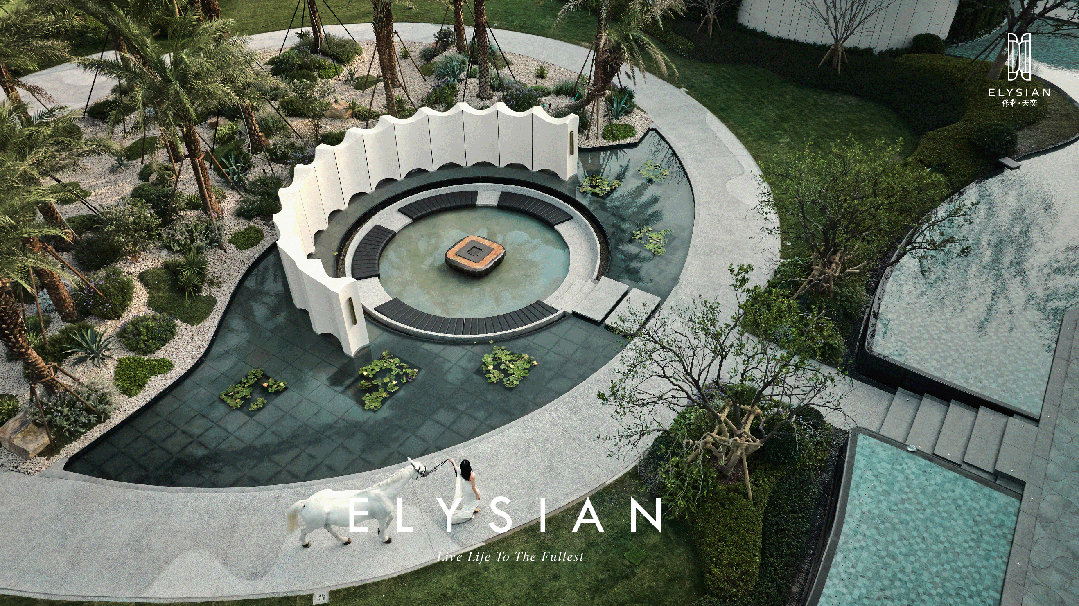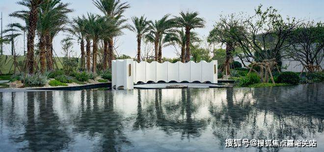 实景呈现的岛屿水院,作为保利天奕五座全球大师花园之一,在银海枣树阵下沉式庭院镜面池畔卡座