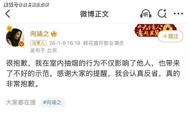 眼看舆论发酵,向涵之团队反应迅速。当天下午,她便通过微博发布手写道歉声明,坦言“室内抽烟行为不当,带来不良示范”,承诺会认真反省。