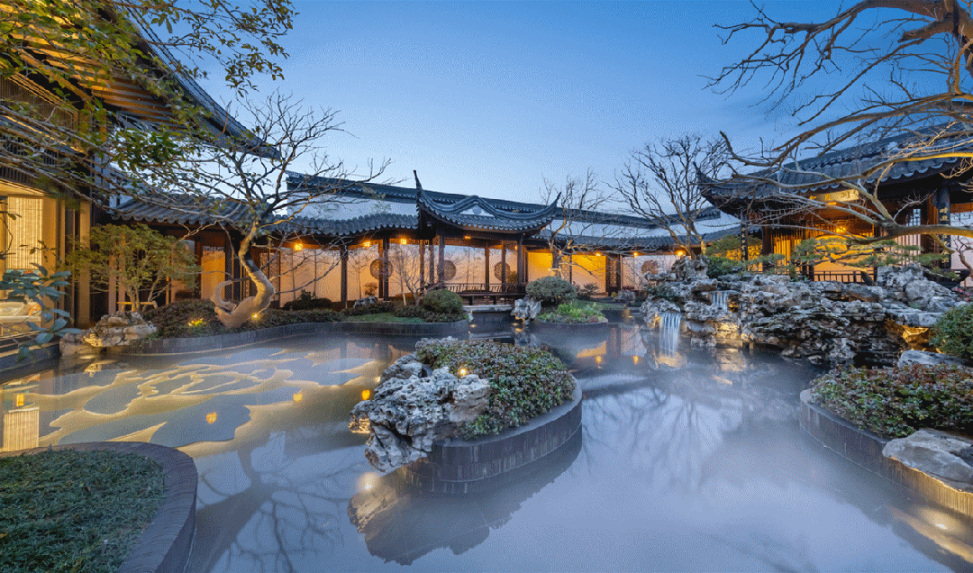 穿过大门的瞬间,城市的喧嚣被悄然过滤,眼前渐次展开的是「一进登门望府、二进启院风荷、三进仙桥绿堤」的三重礼序。
