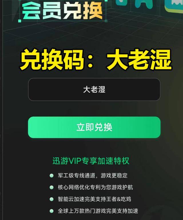 打开迅游加速器APP,在搜索栏输入游戏名就可以直接开启加速,通过迅游假期开启一键加速之后,启动游戏即可流畅游玩,有效解决游戏过程中遇到的延迟卡顿、掉线黑屏等情况。另外,在迅游手游加速器的“个人中心”输入兑换码“大老湿”,免费领取3天VIP会员,解锁专属加速通道。